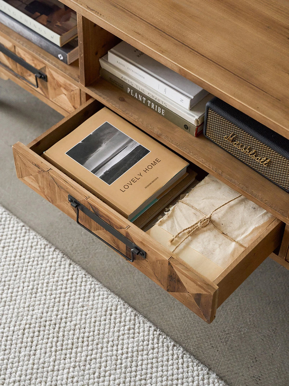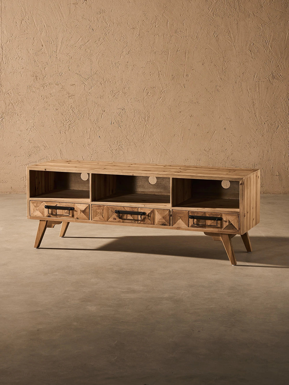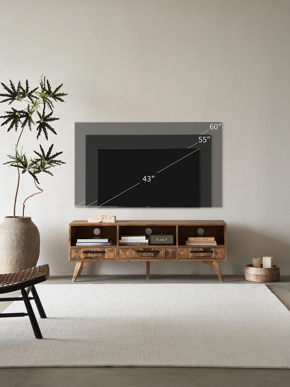 Crafted with a solid fir wood frame and reclaimed wood parquet drawer faces, this TV stand brings natural beauty and texture to your living space. Designed for TVs up to 60 inches, it features a soundbar shelf with a convenient cord management cutout for a tidy setup. Assembly is quick and easy, letting you enjoy its timeless craftsmanship with minimal effort.