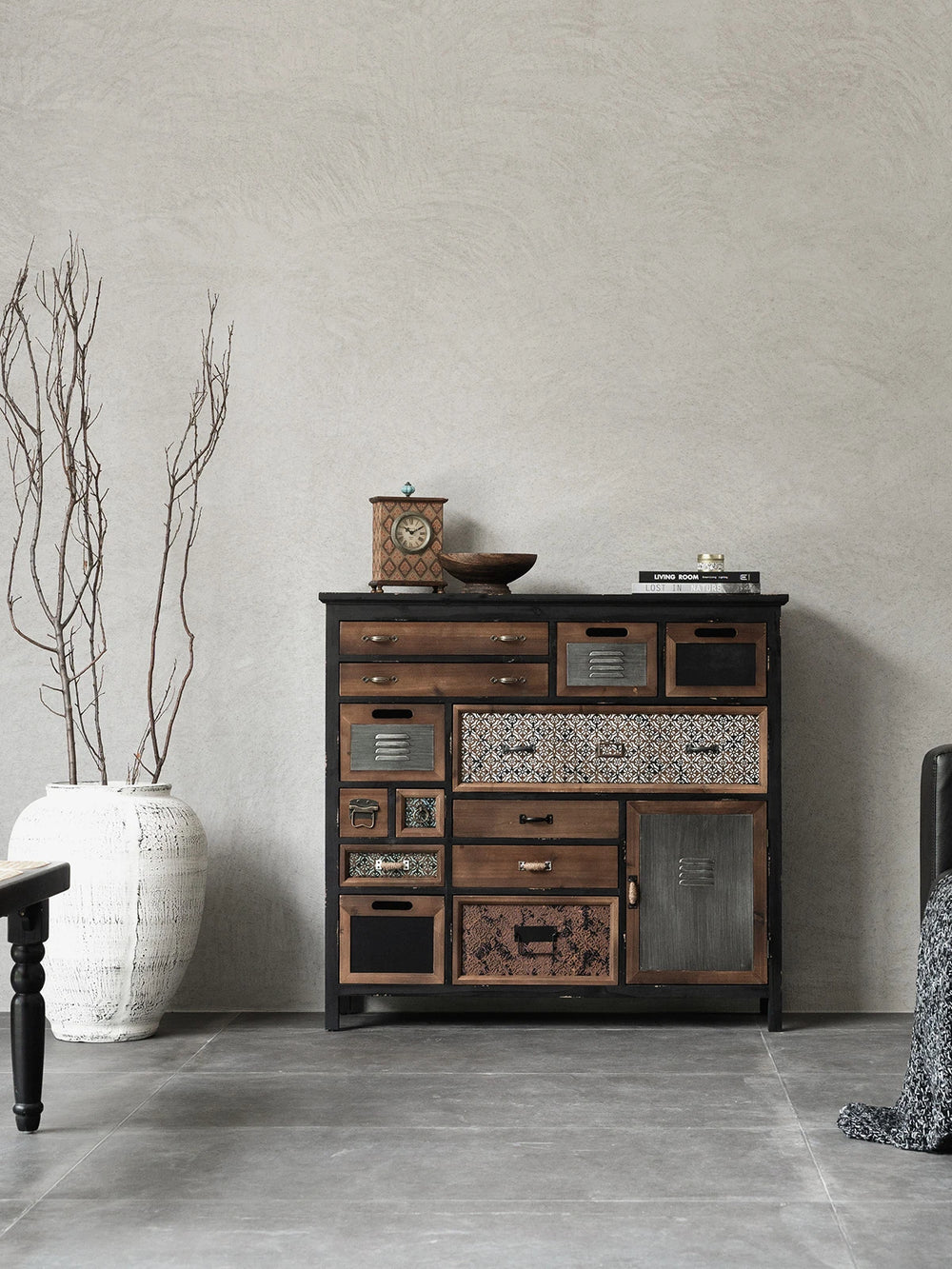 Mixed-Material Drawer Fronts: Solid wood, metal mesh, and shutter panels blend natural & industrial textures.