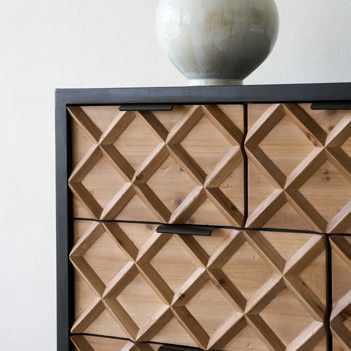 Each drawer front is crafted with individually pieced wood parquet, assembled by experienced craftsmen. The intricate patterns and natural textures give every chest a unique, elegant character that highlights the beauty of reclaimed artistry.