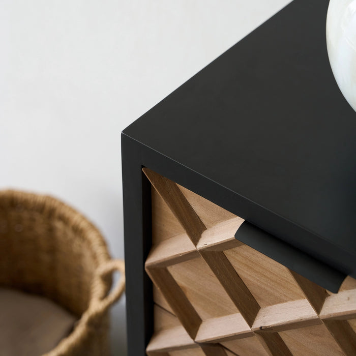 Built with solid fir wood, the dresser is complemented by a sleek matte black frame, creating a modern yet warm contrast that fits seamlessly into a variety of bedroom styles.